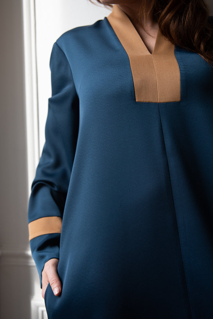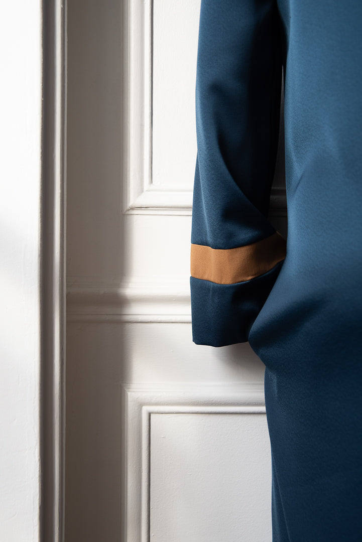 Composition: 100% crêpe de soie / col : 100% crêpe de viscose